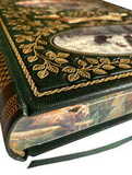 Книжный блок – мелованная бумага, цветные и черно-белые иллюстрации, трехсторонний окрашенный обрез. Переплет из натуральной кожи ручной работы, художественное тиснение золотом, цветной фольгой и блинтом, вставки на обложке – фотопечать по коже, кругленый корешок с бинтами, дублюра, форзацы – дизайнерская бумага, ляссе.