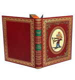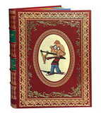 Книжный блок – цветные иллюстрации, трёхсторонний расписной обрез под мраморную бумагу, кожаный переплёт ручной работы, тиснение золотой фольгой и блинтом, художественная вставка, кругленый корешок, бинты, ляссе.