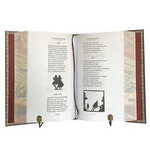 Трехсторонний обрез цветной, расписной, иллюстрирующий содержание книги, переплет ручной работы из натуральной кожи, тиснение золотой фольгой, конгревно-блинтовое глубокое тиснение (рамка), высокое конгревное тиснение (портрет автора), форзацы- дизайнерская бумага, дублюра, ляссе.
