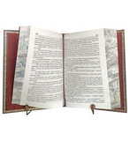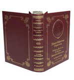 Трехсторонний обрез цветной, расписной, иллюстрирующий содержание книги, переплет ручной работы из натуральной кожи, тиснение золотой фольгой, конгревно-блинтовое глубокое тиснение (рамка), высокое конгревное тиснение (портрет автора), форзацы- дизайнерская бумага, дублюра, ляссе.
